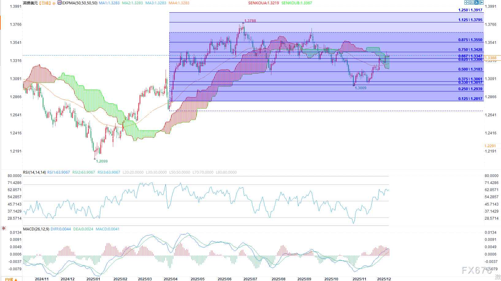 日线图显示,英镑/美元汇率在过去几个月持续反弹,已从11月低点1.300攀升至1.3435的高点。